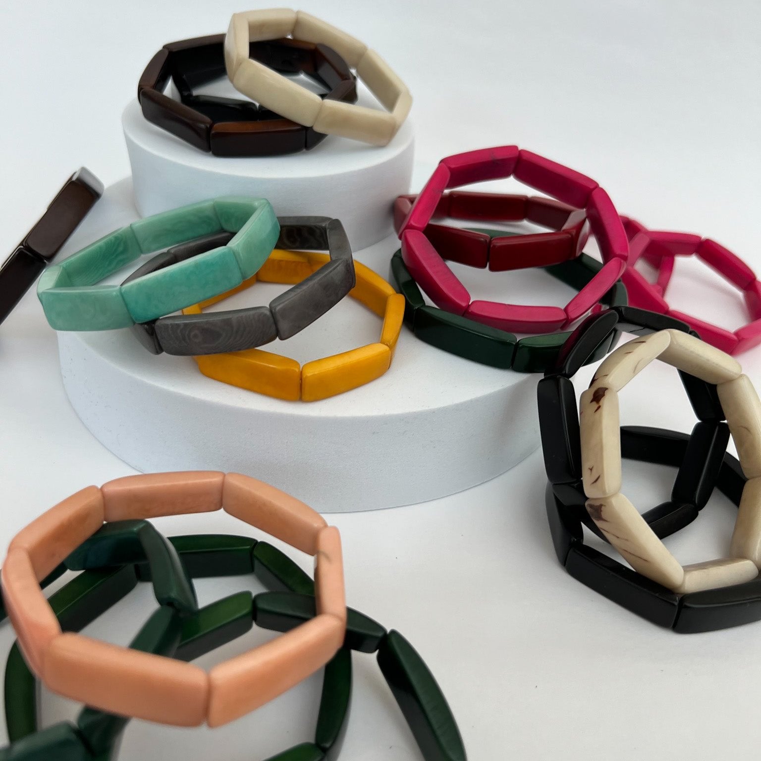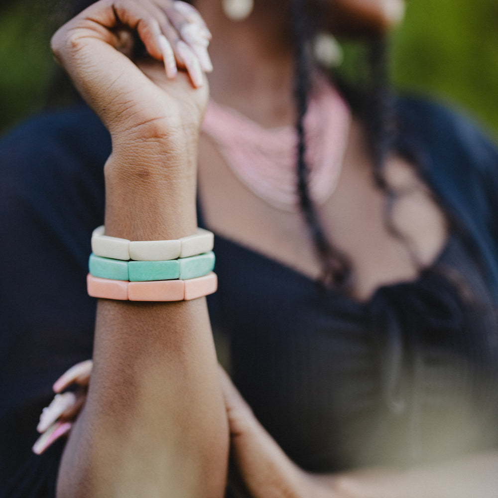 The popular Sierra Slim Bracelets, crafted from sustainable Tagua, are back for a limited time. Available in bold and earthy tones, these sleek, geometric bracelets are perfect for stacking or wearing solo—mix and match to create your ideal look before they sell out!