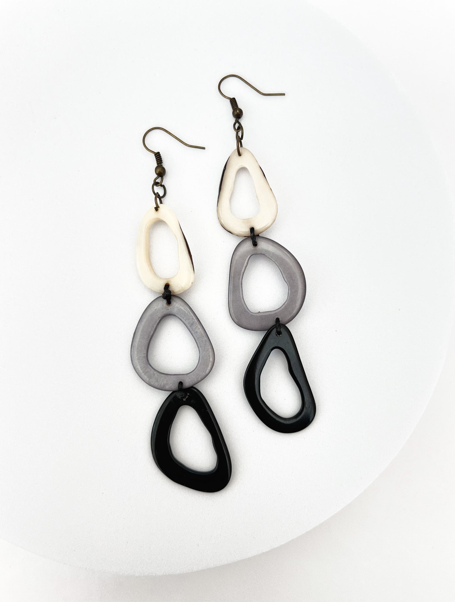 Add a bold touch to your outfit with these stunning artisan-made Tagua earrings, featuring a sleek blend of black, gray, and ivory tones. Lightweight yet statement-making, these eco-friendly earrings are handcrafted with care, offering both sustainable style and effortless elegance.